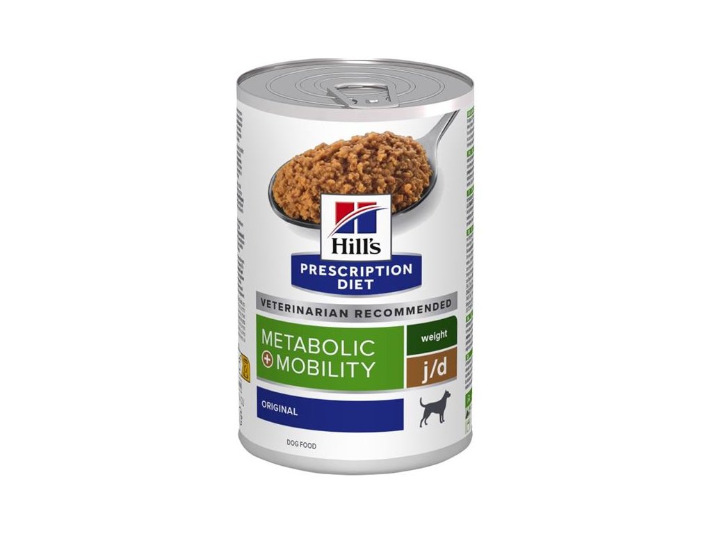 Hill's PD Canine J/D Metabolic & Mobility konzerva je kompletní mokré krmivo pro psy s příchutí tuňáka a zeleninou pro snížení nadměrné tělesné hmotnosti a na podporu metabolizmu kloubů v případě osteoartritidy u dospělých psů.