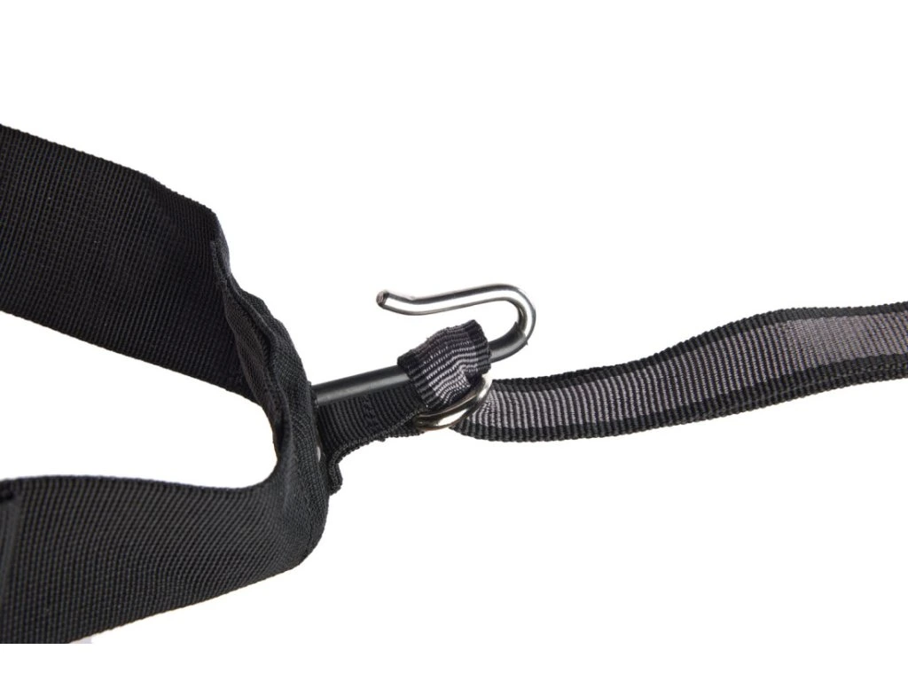Na pás upevníte vodítko do finského háku. Vodítko nejprve provléknete kroužkem a pak vložíte do háku. Jedná se o typické skandinávské připínání vodítka.