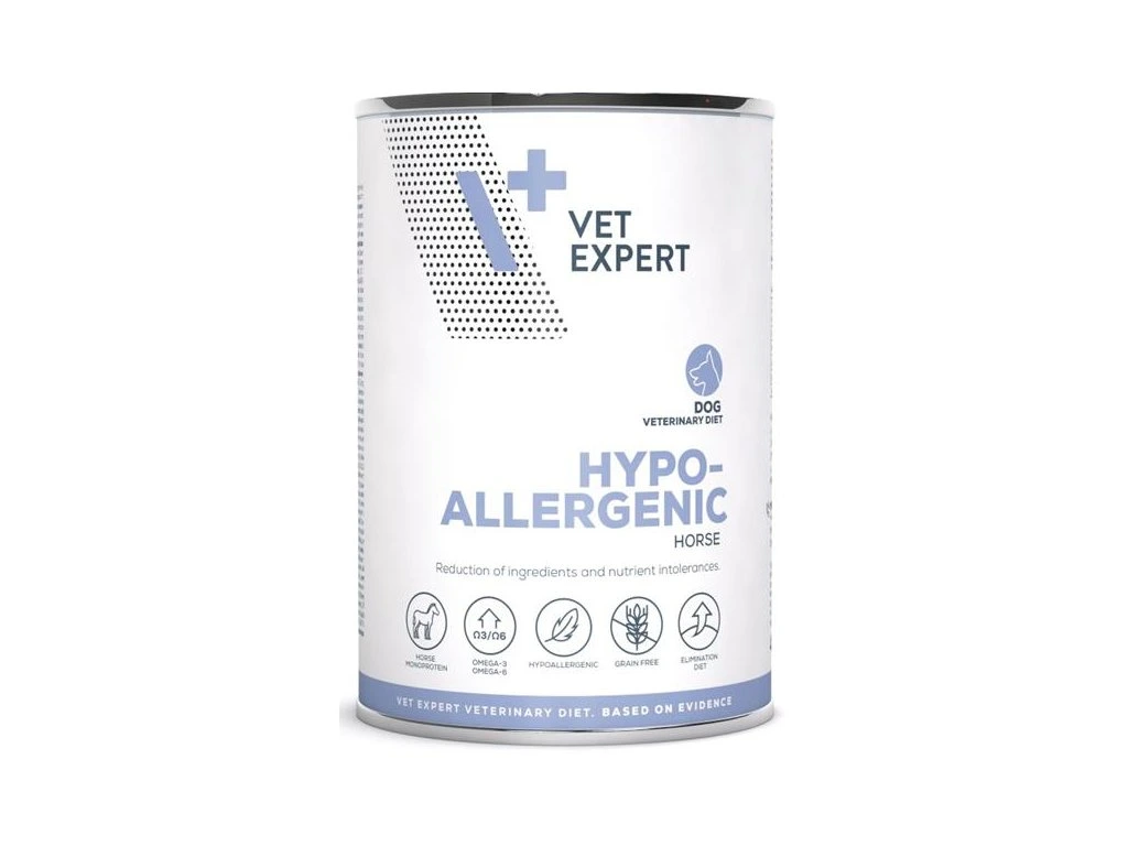 VetExpert Hypoallergenic Horse Mokré je kompletní dietní krmivo pro dospělé psy určené ke zmírnění potravinových nesnášenlivostí a k podpoře funkce kůže při dermatóze a nadměrné ztrátě srsti.