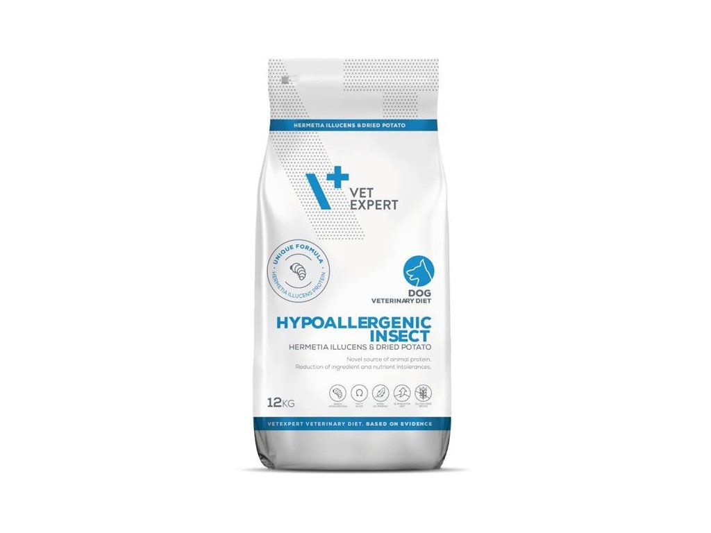 VetExpert Hypoallergenic Insect je kompletní dietní krmivo pro dospělé psy určené ke zmírnění potravinových nesnášenlivostí a k podpoře funkce kůže při dermatóze a nadměrné ztrátě srsti.